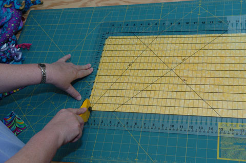 To cut strips, fold your fabric with selvages together and fold again matching the centerfold of the fabric with the selvages. Place the ruler on your fabric, aligning the folded edge of the fabric with the horizontal lines on the ruler. Once your ruler is satisfactorily placed, cut your strips by running your rotary cutter along a slot. To cut squares, rotate your strips 90 degrees (this is especially easy if you have one of those rotating mats) and cut again using the Stripper.
