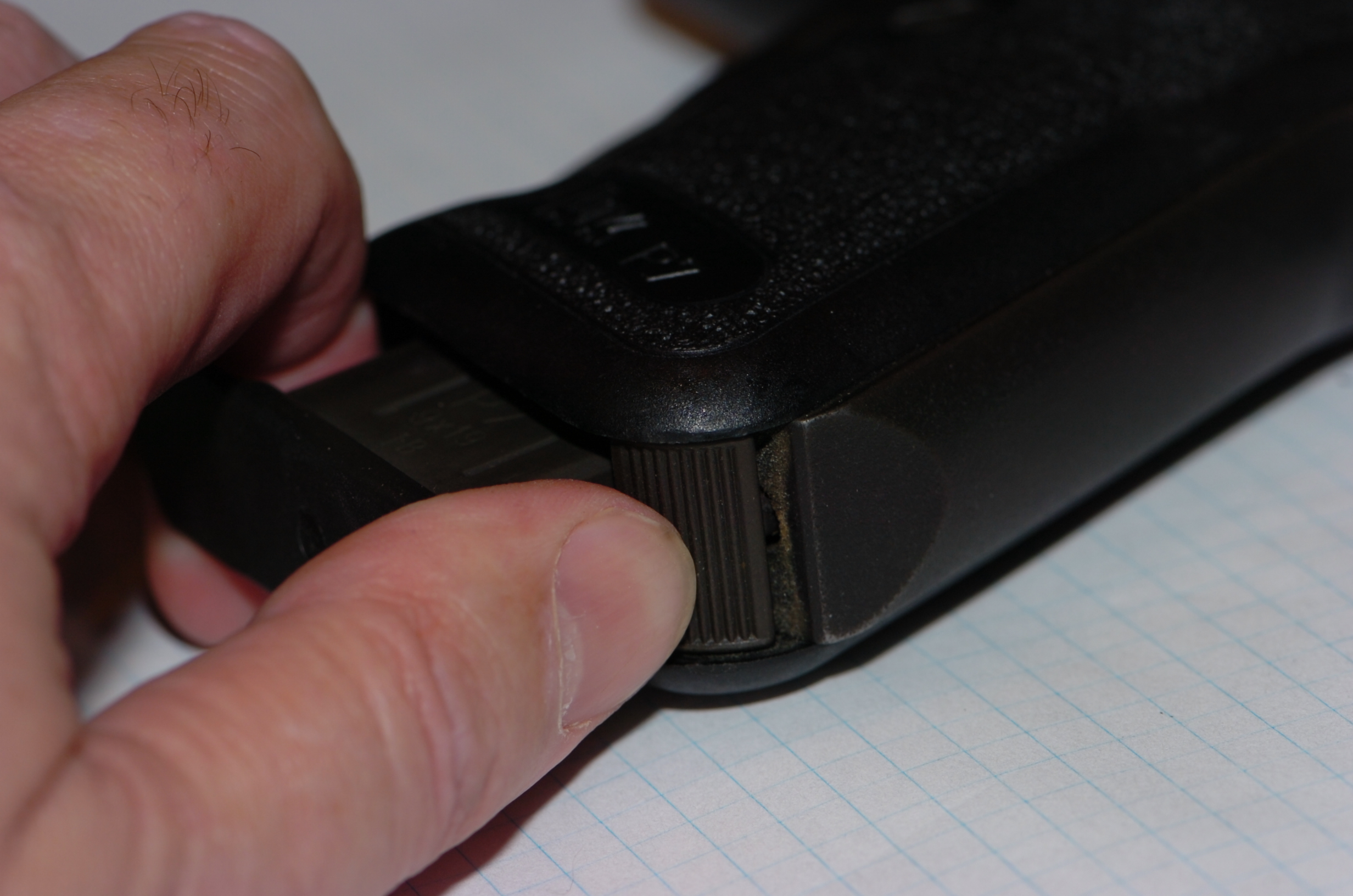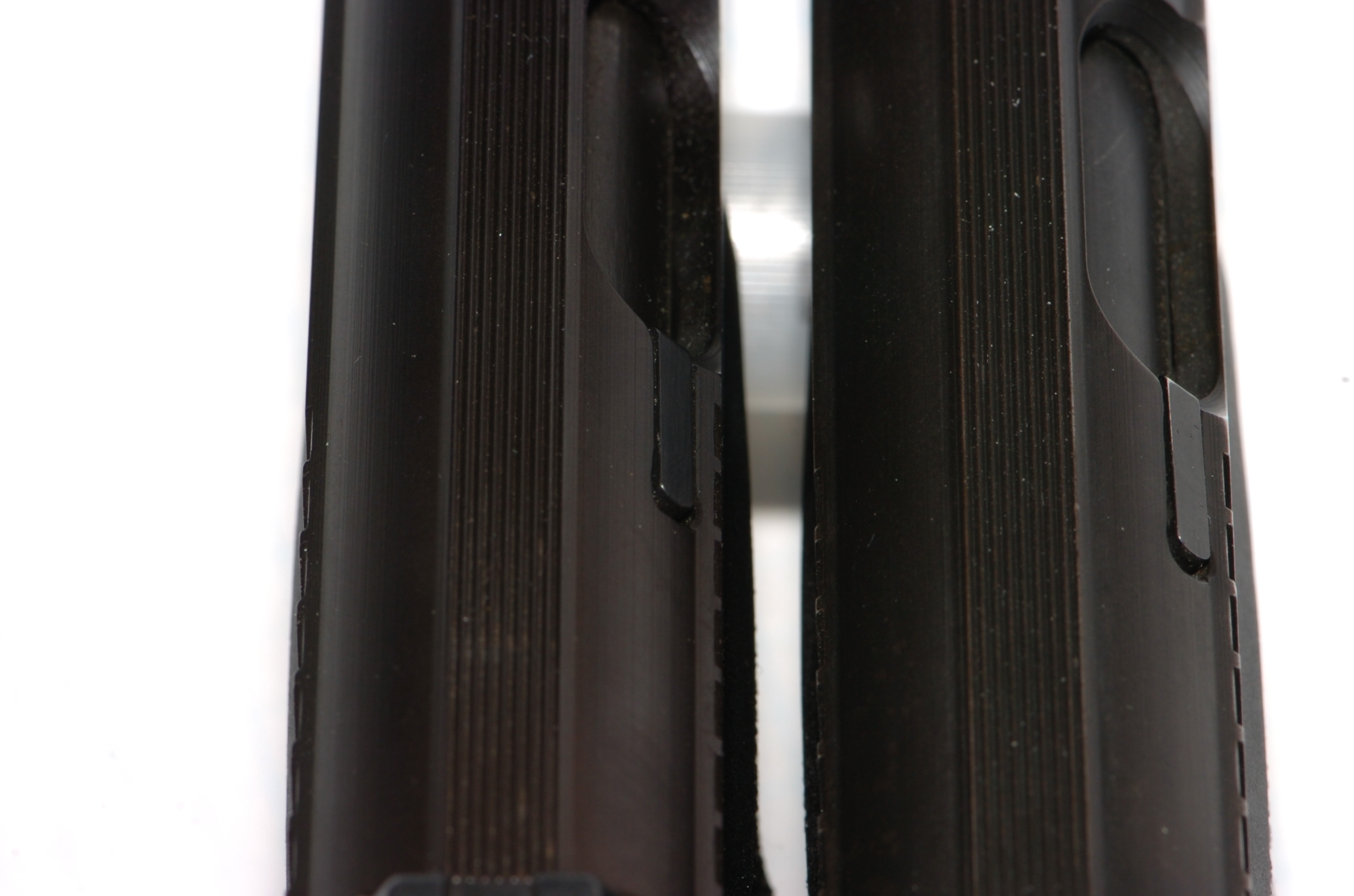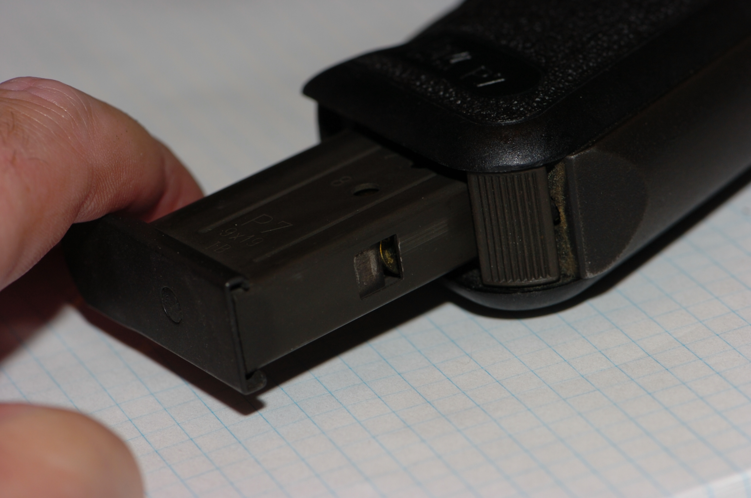 As I describe in the previous section, the P7 has a "European style" magazine release, a button on the heel/butt of the gun just behind the magazine well. This makes the P7 mags different from the P7M8 ones.