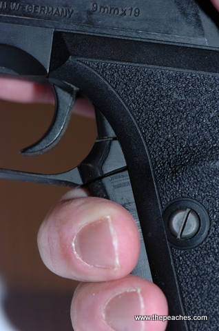 The squeeze cocker lever is also used as a slide release, which makes reloads pretty damn fast. The squeeze cocker is of course fully ambidextrous, being part of the front strap. The slide lock on the P7 is located on the left front, inside of the trigger guard. It is a decidedly low-profile and fussy thing. This means it is a non-factor for getting hung up on a holster, clothing or digging into your hide, but it can be a handicap for clearing Type 3 Malfunctions, where one of the key steps is locking the slide back manually.