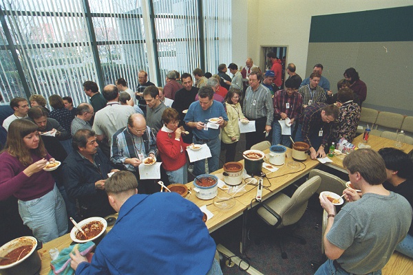 This shot is taken from standing atop one of the tables. Appears to be Bounce Flash, but mostly ambient. Yours truly in the blue tie at mid-right. Obviously a friend took the picture.