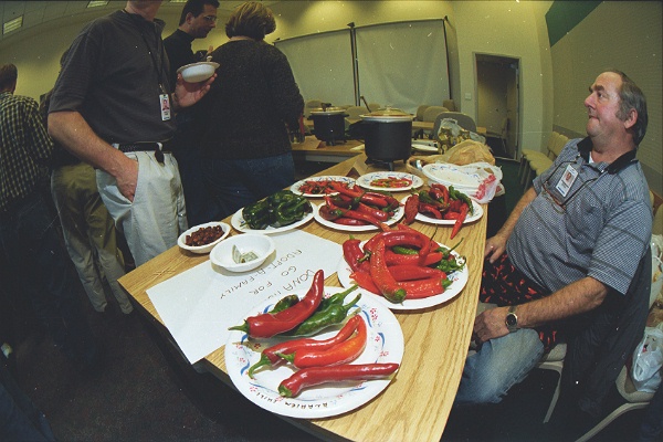 This guy grows all his own chili peppers, and uses them in our annual chili cook-off. Foreground light is from an SB-26 flash handheld on an SC-17 cord. The flash is set for 18mm coverage, held high overhead and angled down to light the chilis. If memory serves, the nearest plate of chilis was 12-18 inches away from the front of the lens.