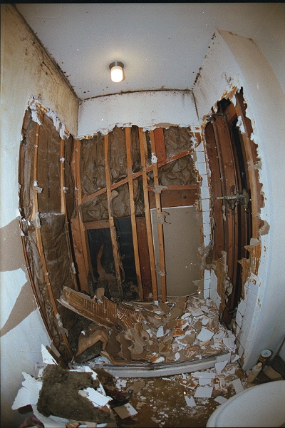 A documentation photo of a bathroom demolition / remodel in progress. That's a 48" opening shower stall. It's photographed from about 3 feet away. Lit with an SB-26 set to 18mm (on camera).