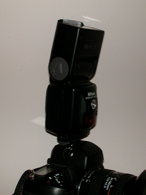 - Bounce flash - direct on-camera flash has a 'look' that's pretty unnatural, kinda like shining a flashlight in somebody's face. Also, it can produce red-eye. Bounce flash allows you to tilt the flash head up to bounce it off of a white (or light neutral color) ceiling. When the flash returns from the ceiling to light your subject, the 'character' of the light has changed in two important ways: one, it comes from above, which is the way we have come to expect lighting to 'naturally' appear; and two, it is much softer in appearance. It's 'softer' because the light source is now 'larger'. Instead of the light coming from the 4 square inches of the flash head, it now comes from the 10 square feet of the illuminated portion of the ceiling. This is like the difference between harsh sunlight and the soft light of an overcast day. Here's an example of bounce flash: